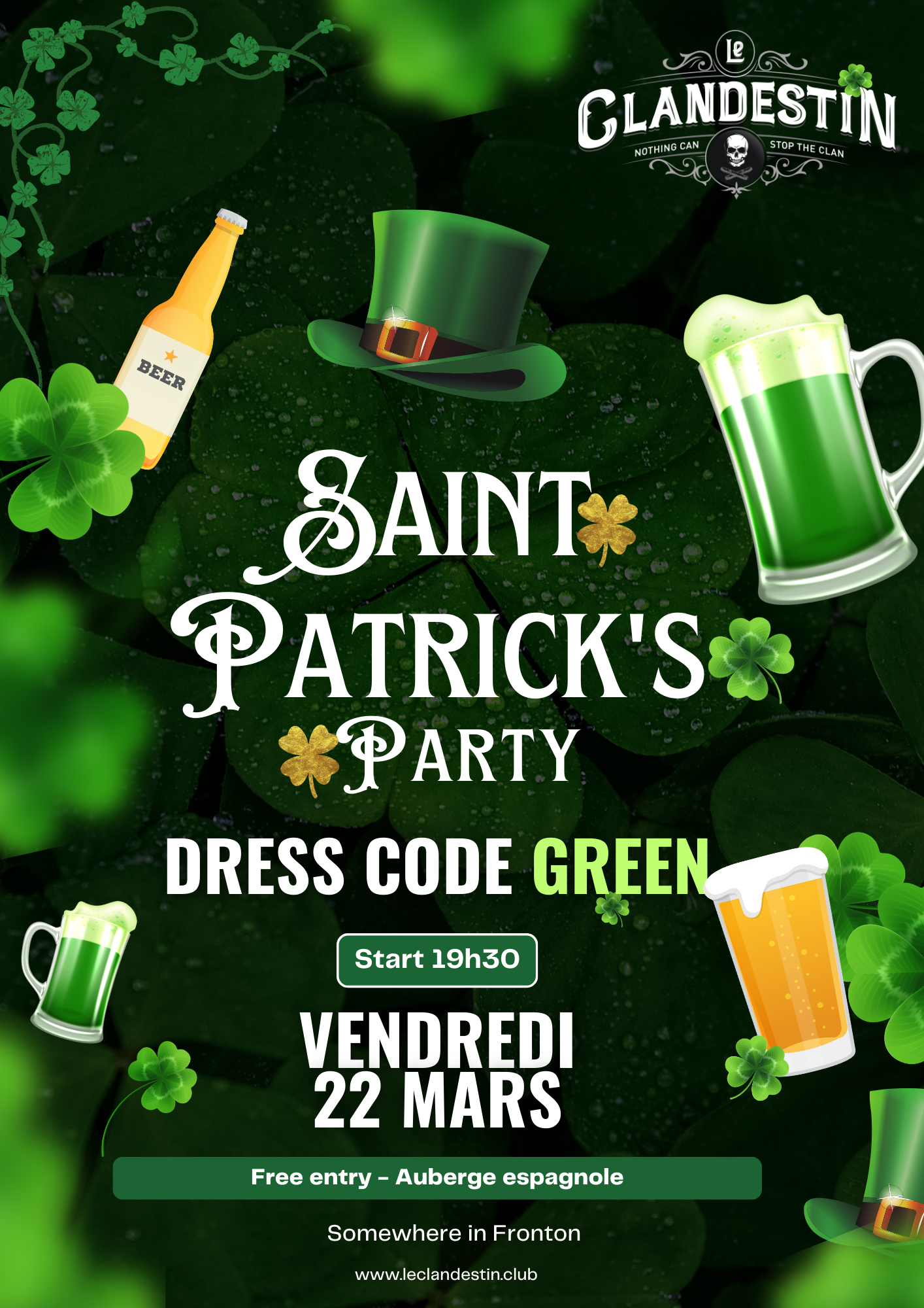 Au Clandestin il y a des Saints qui nous parlent plus que d'autres et Saint Patrick arrive probablement en tête de notre classement des Saints préférés. Saint Patrick bouta hors d'Irlande les traditions polythéistes Bon. Ce n’est pas ce qu'il a fait de mieux puisque selon nous plus on est de fous plus on rit que ce soient des Dieux, des Saints, ou des Amis. Mais grâce à son discours au Roc de Cashel, Pat' a fait de ce jour, au fils des siècles, un jour où l'on célèbre l’Irlande. Et dans les trucs que fait bien l'Irlande on trouve entre autres la bière et le Whisky ! (Ils font aussi des trèfles mais on n’a pas beaucoup d'herbivores au Clandestin). Amis Clandestin enfile donc ton plus beau chapeau vert, ton sweat Guinness, ou quoi que ce soit qui rappelle l'Irlande, cuisine un petit plat à partager avec les apôtres de Saint Pat' et viens fêter ça avec nous en mode auberge Espagnole !